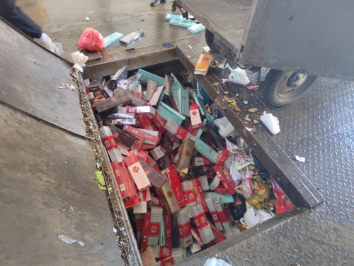 乐业县局工作人员将罚没卷烟拉到乐业县板霞垃圾中转站,在专卖办、内管组工作人员及乐业县公安局、市场监督管理局代表的互相监督下,对涉案罚没卷烟进行清点、核对,并由垃圾中转站工作人员当众采取液压机液压粉碎公开销毁,然后拉到乐业县同乐镇西凤坳垃圾场进行填埋处理。