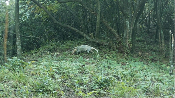 从红外相机拍摄的画面中可以清晰看到,这只猪獾全身毛发呈现出与众不同的白色,与正常猪獾的黑褐色毛发形成鲜明对比。其身形与普通猪獾无异,头部较为扁平,吻鼻部像猪一样向前突出,圆滚滚的身体搭配短粗四肢,模样憨态可掬。这只白化猪獾在一处原始次生林灌木丛中悠然自得地活动,时而用鼻子在地上探寻食物,时而警惕地张望四周。