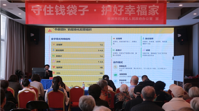 为进一步增强养老服务领域的金融风险意识,守护好人民群众的“钱袋子”,近日,株洲市人民政府办公室联合石峰区政府办公室开展养老服务领域防范非法金融活动宣传活动,石峰区人民检察院第一检察部副主任刘怡廷受邀前往养老中心,以“守护养老钱,共筑防护网”为主题,进行了一场生动的授课。