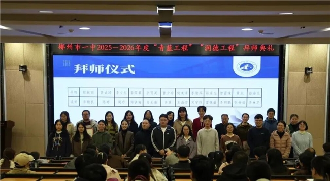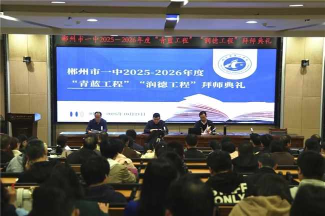 为加快推进青年教师队伍建设,充分发挥优秀骨干教师的引领示范作用,帮助青年教师快速提升专业能力与教学水平,进一步优化教师队伍整体素质,10月 21日下午,湖南省郴州市第一中学在图书馆五楼报告厅隆重举行2025—2026学年“青蓝工程”“润德工程”表彰暨拜师典礼。学校领导班子成员出席典礼,2025—2026学年“青蓝工程”“润德工程”全体结对师徒、2024—2025学年获奖师徒代表参加活动。此次典礼由学校党委委员、副校长陈亮朝主持。