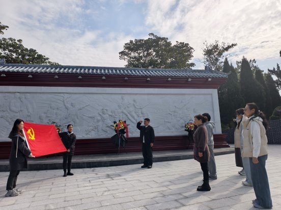 烈士陵园内松柏苍翠、静穆庄严,全体党员教师整齐列队于烈士纪念碑前。党员代表向革命先烈敬献花篮,花篮上的缎带寄托着对英烈的深切缅怀。随后,全体人员怀着崇敬之心三鞠躬,并默哀一分钟,用庄重的仪式表达对革命先烈的崇高敬意。紧接着,党支部书记带领全体党员举起右拳,面向鲜红党旗重温入党誓词,铮铮誓言铿锵有力,回荡在纪念广场上空,进一步坚定了党员教师“为党育人、为国育才”的初心使命。