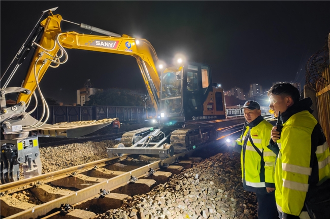 “智翔,注意道砟高度,尽量让新轨枕一次性放置到位。”肇庆综合维修车间助理工程师郭承俊紧盯着挖掘机,手持对讲机喊道。