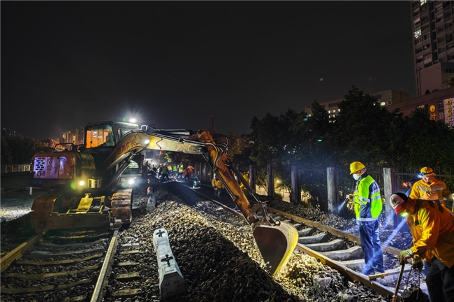“天窗命令已下达,可以作业!”11月26日晚上,随着施工负责人、肇庆综合维修车间副主任李尧一声令下,职工们各司其职,有条不紊地开始了轨枕加密作业。