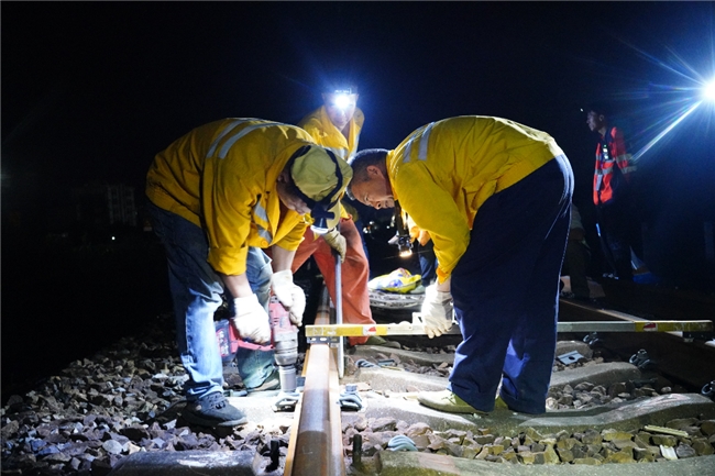 夜阑人静,寒风凛冽。近日,在三水火车站站内,广铁集团肇庆工务段80余名作业人员正忙得热火朝天,他们要在240分钟的时间内完成400根轨枕加密作业任务。