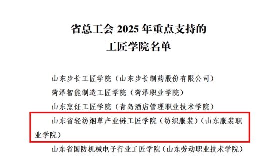 近日,山东省总工会公布了2025年重点支持的工匠学院名单,山东服装职业学院申报的“山东省轻纺烟草产业链工匠学院(纺织服装)”入选,正式跻身省级工匠学院行列,实现了学院工匠学院建设的跨越式突破。