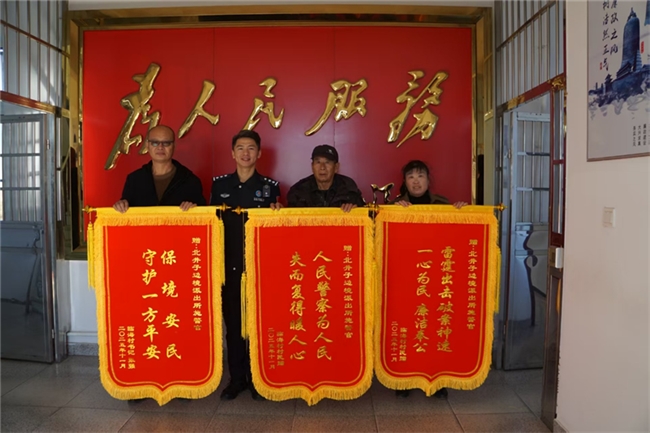 阳光微暖,风柔天蓝。近日,辽宁丹东边境管理支队北井子边境派出所营区格外热闹,手机被盗的宋女士,河蟹被偷的陶先生,还有北井子镇临海村张书记,分别手持锦旗,一同来到派出所,向该所民警施恒顺表达谢意。