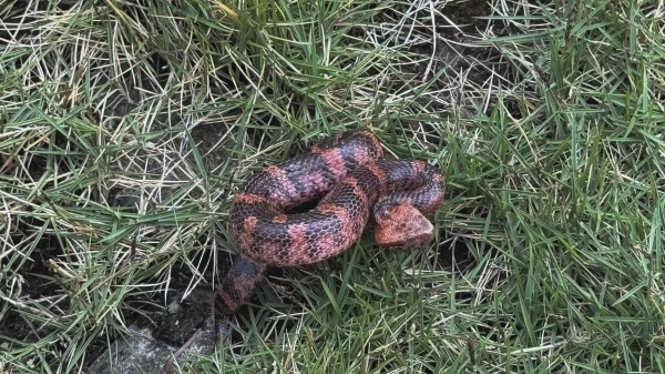 近日,巡查人员在两江峡谷的密林草丛中,被一道醒目的红黑斑纹吸引——一条蛇类正缓慢移动。“它的头部呈三角形,颜色通红如烙铁,身体粗短有力,和常见的烙铁头蛇不同,更像资料里的台湾种类。”工作人员回忆道。