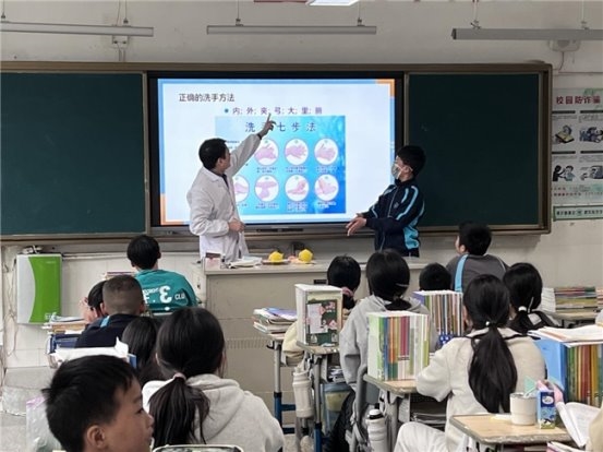莫干山镇卫生院下派副院长周建江医师通过生动、易懂的表达,直观地讲解了流感的种类、症状、传播途径、预防等相关知识。针对学生群体特点,强调应“勤洗手、戴口罩、常通风”,并宣传了适时接种流感疫苗的重要性。在“如何预防流感”环节,周医生带着孩子们现场模拟“七步洗手法”的每一个步骤,确保动作标准到位。