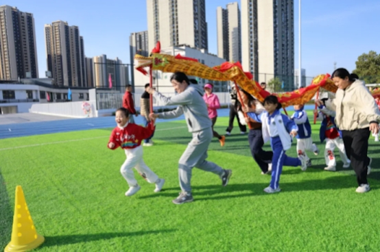 亲子运动会上,萌娃和家长们一起参与趣味比赛,笑声此起彼伏。舞龙、巨型飞镖、凝心聚力......每一个项目都考验着亲子间的默契配合。家长李先生感慨道:“平时工作忙,很少有机会这样全身心陪孩子玩耍,今天特别开心!”