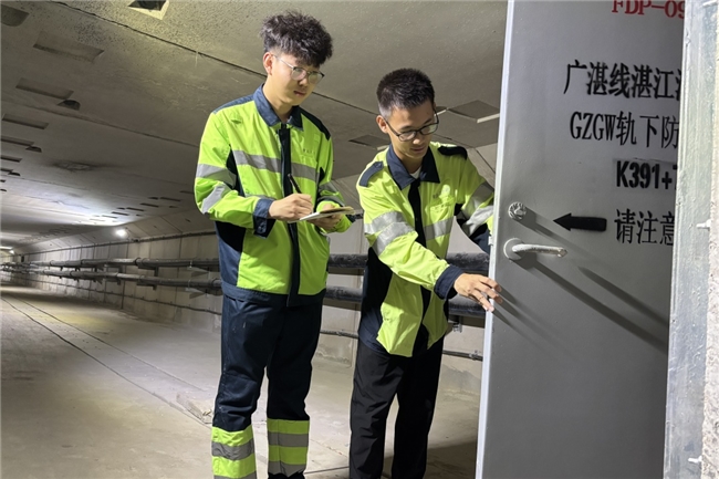 近日,湛江湾海底隧道入口,肇庆工务段阳江北高铁路桥车间湛江北路桥检查工区工长袁浩浩带领3名职工戴着头灯,手持检查锤走向隧道深处。“进去前要先做气体检测。”袁浩浩拍了拍肇庆工务段阳江北高铁路桥车间湛江北路桥检查工区桥梁工许志龙的肩说。
