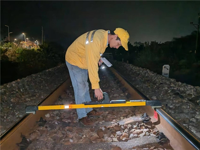 20时29分,“天窗”命令下达,田军带领工友拿着工具,迅速进入作业地点。按照作业分工,大家立即开始了紧张的检查测量,田军手执道尺,逐段测量线路轨距、水平,并在轨枕写下每个测量数据。紧随其后的职工按照他的要求,很快扒好镐窝放好起道器,田军俯身在基准轨上,仔细查看钢轨头部下颚水平延长线高低情况。