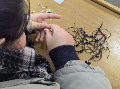 本次活动以“珠串协作·文化共融”为主线,构建“体验+分享”一体化框架:各民族学生组队围坐一起,汉族同学讲解串珠技法,维吾尔族同学分享家乡传统珠饰的纹样寓意,苗族同学则带来了独特的彩色珠粒搭配方式,在协作串珠中完成文化交流。一位参与活动的同学说:“每一颗珠子都像我们各民族的一员,单独看各有特色,组合在一起却能呈现出和谐美好的整体,这正是‘石榴籽精神’的生动体现。”