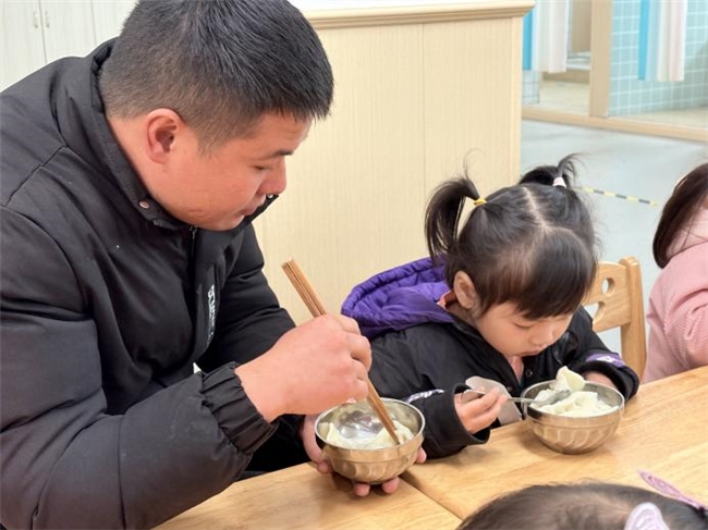 在亲子互动环节中,接力跳圈圈、合力运球等游戏欢声笑语不断,大大提高了亲子情感和默契配合;在手工制作环节,家长与孩子们共同为纪念照打造专属相框,封装成长感动。在最具烟火气的饺子宴环节,亲子协作包饺子、共品美味,暖意融融。