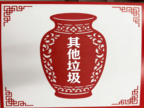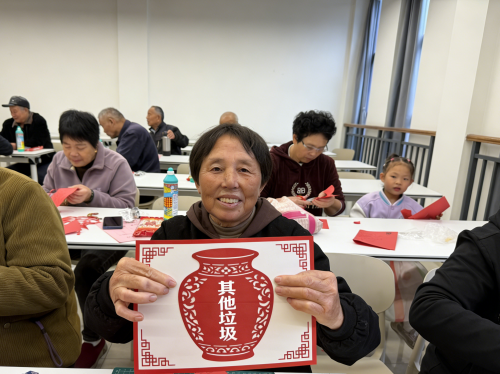 活动现场,桌上整齐摆着剪纸材料,背景板上贴着提前创作的“四色桶剪纸样板”,对应四类垃圾的元素成了居民创作的“灵感锚点”。“大家看,可回收物的剪纸要配上瓶罐纹样,这代表塑料、纸张能循环利用;厨余垃圾的桶要加树叶,因为它们能‘回归自然’变肥料。”志愿者一边演示剪纸技法,一边拆解图案背后的分类知识,原本枯燥的分类标准,随着剪刀的开合变得生动起来。