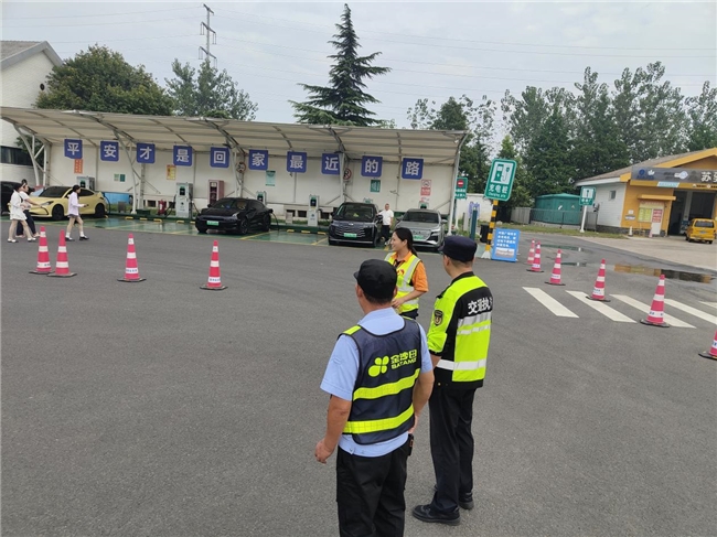 执法人员积极协同服务区工作人员在充电区域的关键位置加强值守,引导车辆有序进出与停放,避免出现抢道和拥堵现象。