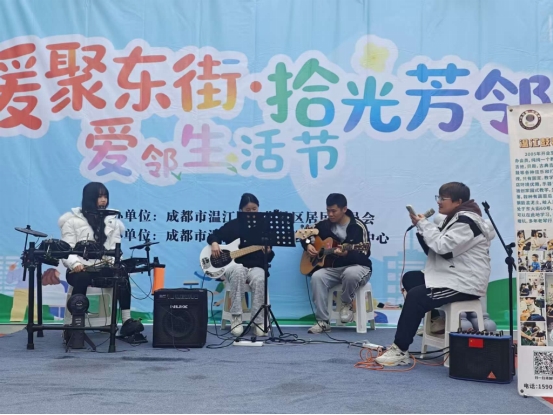 音乐是梦想的翅膀。舞台区域,温江鼓琴堂琴行带来的架子鼓、吉他等乐器演奏,不仅展示了学员们的学习成果,更主动为爱唱歌的居民伴奏,让动人旋律流淌在人们心间。
