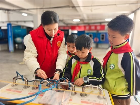 在科技馆内,“引力弹弓”“频闪动画”等科普展品吸引着学生们的目光。大家在志愿者的指导下动手操作、仔细记录,沉浸式探索科学奥秘,课堂外的科技实践让孩子们的求知欲得到充分释放。学生们或围在一起讨论原理,或专注完成研学记录,现场充满探索的乐趣。