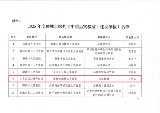 近日,山东省聊城市卫生健康委员会公布2025年度聊城市医药卫生重点学科、重点实验室评审结果,聊城市东昌府区妇幼保健院儿科内科学、助产学获评市级医药卫生重点学科建设单位,生殖健康重点实验室获评市级医药卫生重点实验室建设单位,实现学科建设与科研平台建设的双重突破。